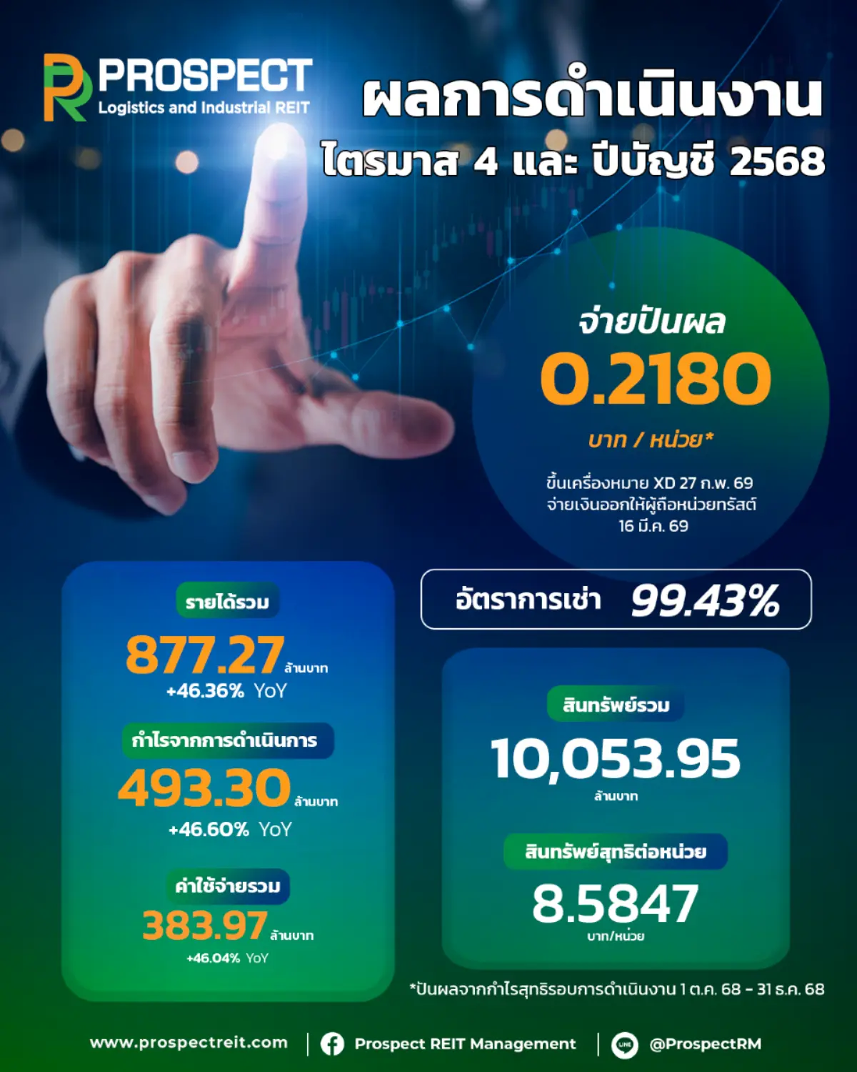นางสาวอรอนงค์ ชัยธง ประธานเจ้าหน้าที่บริหาร บริษัท พรอสเพค รีท แมเนจเมนท์ จำกัด ในฐานะผู้จัดการกองทรัสต์ กล่าวว่า “ผลงานไตรมาส 4 และภาพรวมทั้งปี 2568 เป็นไปตามที่คาดการณ์ไว้ ทั้งรายได้ที่เพิ่มขึ้นหลังจากการลงทุนเพิ่มเติมและการจ่ายปันผลทั้งปีที่ 0.8280 บาทต่อหน่วย รวมถึงอัตราการเช่ามีการเติบโตทำสถิติใหม่จากไตรมาสก่อนหน้า ด้วยกลยุทธ์การลงทุนในทรัพย์สินคุณภาพสูงและบริหารจัดการอย่างมีประสิทธิภาพของผู้จัดการกองทรัสต์ ขณะเดียวกันอัตราการต่อสัญญา (Renewal Rate) ในปีที่ผ่านมายังอยู่ในระดับสูงถึง 98.24% ตอกย้ำศักยภาพของโครงการภายใต้กองทรัสต์ ซึ่งล้วนตั้งอยู่บนทำเลศักยภาพสูง เสริมสิทธิประโยชน์ทางภาษีพื้นที่ Free Zone และบริการ One Stop Service ครบวงจร หนุนนักลงทุนไทยและต่างชาติตั้งฐานการผลิตระยะยาว สอดคล้องไปกับทิศทางการลงทุนในภาคอุตสาหกรรมที่เรามองเห็นแนวโน้มของผู้ประกอบการต่างชาติสนใจเช่าคลังสินค้าและโรงงานสำเร็จรูปเพื่อเพิ่มความคล่องตัว รวมถึงอัตราเร่งของการเช่าอาคารที่รวดเร็วมากขึ้น โครงการที่มีมาตรฐานพร้อมตอบโจทย์ครบครันจึงสามารถรองรับดีมานด์ตรงนี้ได้ ก้าวต่อไป เราตั้งเป้ารักษาผลการดำเนินงานและบริหารจัดการกองทรัสต์ให้ดีอย่างต่อเนื่อง เพื่อส่งต่อผลตอบแทนที่สม่ำเสมอให้แก่ผู่ถือหน่วยทรัสต์”